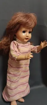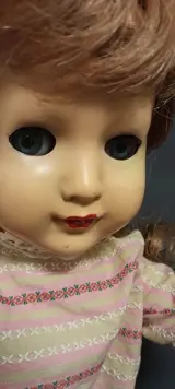 Schildkröt pop 46, lichaam en hoofd gemaakt van Tortulon, 45cm lang met echt haar pruik, clicker slaapogen en linnen jurk, jaren 50