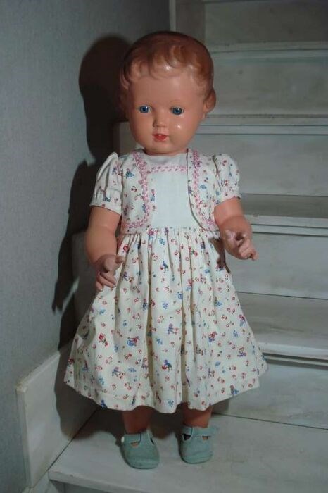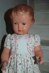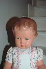 Schildpadpop, getekend logo schildpad in ruit 70, gesloten mond en 2 tandjes, 70cm, blauwe glazen ogen, gemoduleerd bruinhaar,