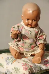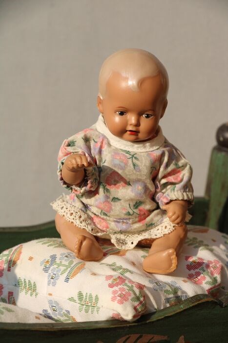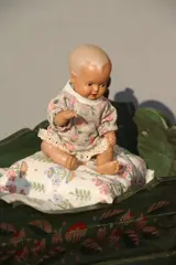 Klein zitpopje van Schildkröt. Gemerkt aan de achterkant met Schildkröt teken en 16. Originele kleding? Popje heeft handgeschilderde bruine ogen en open rode mond. Popje is circa 16cm groot.