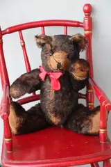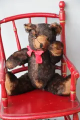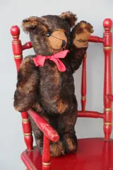 Schuco bruine teddybeer. Deze mooie beer heeft een bromstem en is 23cm groot. Op zijn linkerhand het merk Schuco met het nummer 203. Mooie teddybeer die gemaakt werd begin jaren tachtig. Goede conditie.