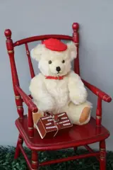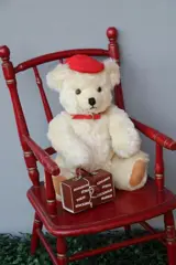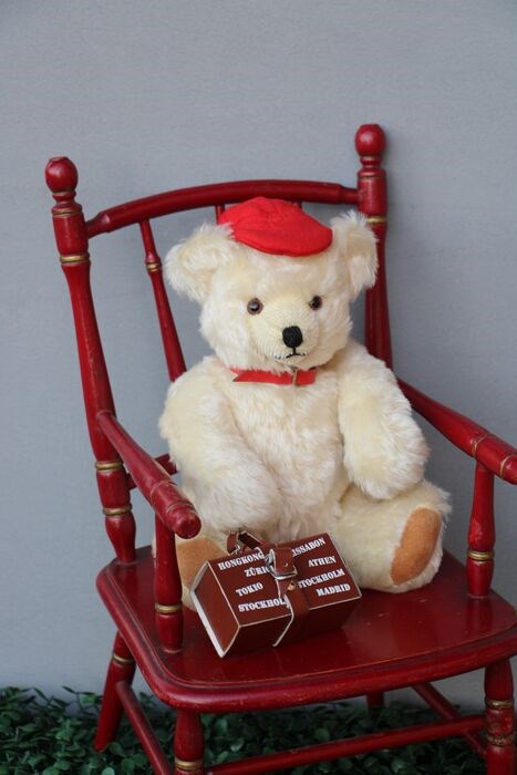 Teddybeer van Schuco. Deze wereldreiziger heeft een Franse pet op. Heeft een aan de buitenkant echt leren koffertje. In het koffertje zit een Schuco miniatuurauto (porsche). Komt niet vaak voor en is een zeldzamere editie van Schuco. Met certificaat. Gelimiteerde editie van 500. Dit is beer 50. De beer is 26cm hoog met bromstem. Goede conditie.