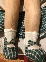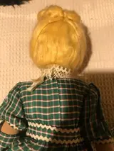 Antieke pop, goed onderhouden en zeer compleet en mooi in de details. Blond haar met chignon, blauwe ogen, kanten kraag. Jurk van frisse katoenen stof met groene en witte ruiten met bijpassende schoenen. Compleet met gedateerd onderbroekje en petticoat.