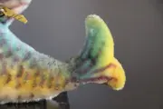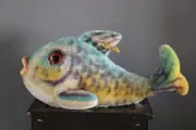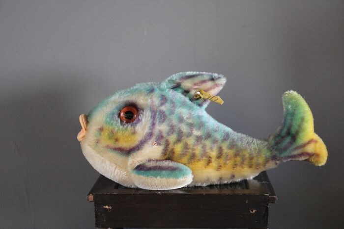 Flossy de vis, gemaakt door Steiff in 1964. Hij is hoog 14cm en breed 28cm. Gemaakt van mohair. Hij heeft het Steiff knoopje en restant van het vaantje. Redelijke conditie/