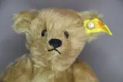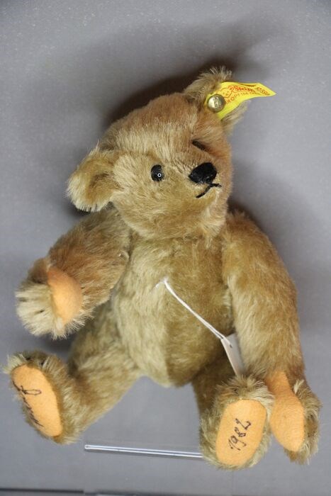Hij komt met zijn originele (dunne) witte doos, met Steiff knoopje en vaantje en de papieren handleiding aan de beer vast. De druk piepstem heeft nooit gewerkt van deze teddybeer. Ik heb hem destijds bij Margaret Strong Museum gekocht.