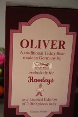 Aangeboden de Teddybeer Oliver, gemaakt door Steiff voor Hamleys, London, UK. De beer is gemaakt in 1990. De beer is 36cm groot. Het is een gelimiteerde editie van 2000 stuks, dit is nummer 375. Hij zit nog in de originele doos vast.