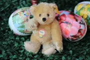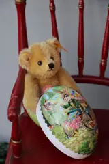 Teddybeer Petsy, uitgegeven door Steiff in de Historische Miniaturenreeks. Dit is de versie met goudblond mohair. Armen, benen en hoofd beweegbaar. is voorzien van papieren borstetiket, Steiff knoopje en vaantje. Redelijke conditie.