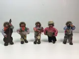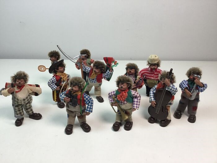 11 Micki / Mecki / Mucki Peters van Steiff uit de jaren 50. Over het algemeen in goede, tweedehands staat. De tennisspeler mist zijn tennisbal, maar verder lijken ze compleet te zijn. Ze zijn ongeveer 8 cm hoog.