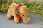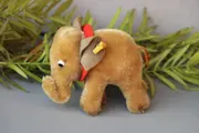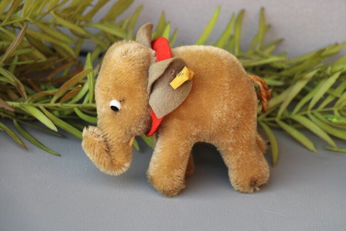 Klein olifantje in bruin mohair. Gemaakt in 1960. Het vaantje met Steiff knoopje zit vastgeniet aan het oor. Dit is helaas uitgescheurd en zo is het nog bij het olifantje/ Redelijke staat. De bruine olifant zie je bijna niet. Het zijn altijd de grijze die van Steiff worden aangeboden.