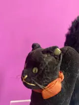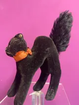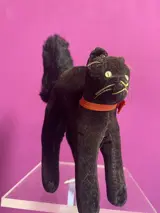 Zwarte kater van Steiff, zonder staart 10cm hoog, met staart circa 14cm hoog. Rode originele strik. Steiff knoopje inn het oor. Slijtage aan de fluwelen poten. Mooi klein katje ondanks de slijtage. Redelijke toestand.