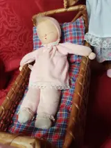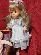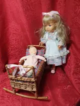 Dit leuke tafereeltje bestaat uit een lmooie pop met blauwe glazen slaapogen en mooi blond, lang haar in een beeldig jurkje met roze schoentjes en wit broekje. Verder een pitrieten schommelwiege