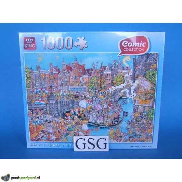 Puzzel van 1000 stukjes met als thema Amsterdam Queen's day van het merk King. Deze puzzel doet denken aan de Jan van Haasteren puzzels van Jumbo. Zit nog in de ongeopende originele verpakking.