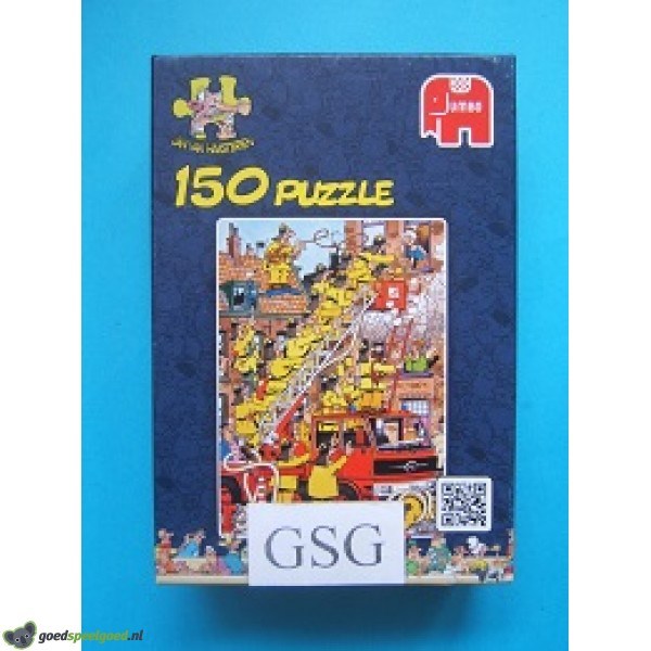 Puzzel van Jan van Haasteren uit 2013 van 150 stukjes met als thema brandje blussen van het merk Jumbo.
