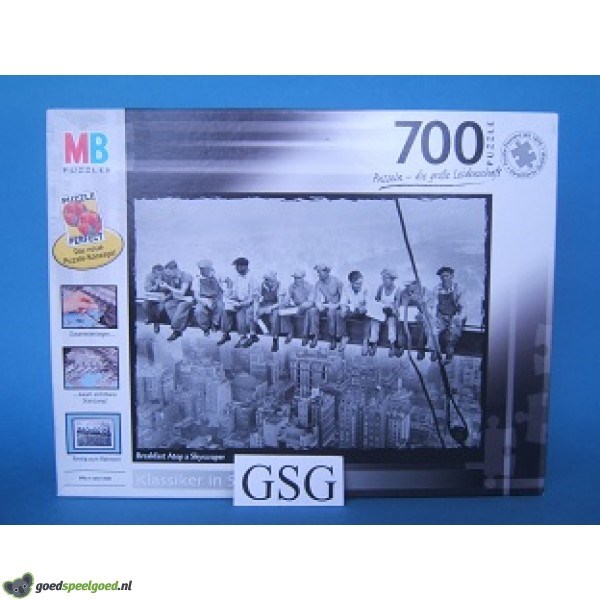 Puzzel van 700 stukjes met als thema breakfast atop a skyscraper van het merk MB.
