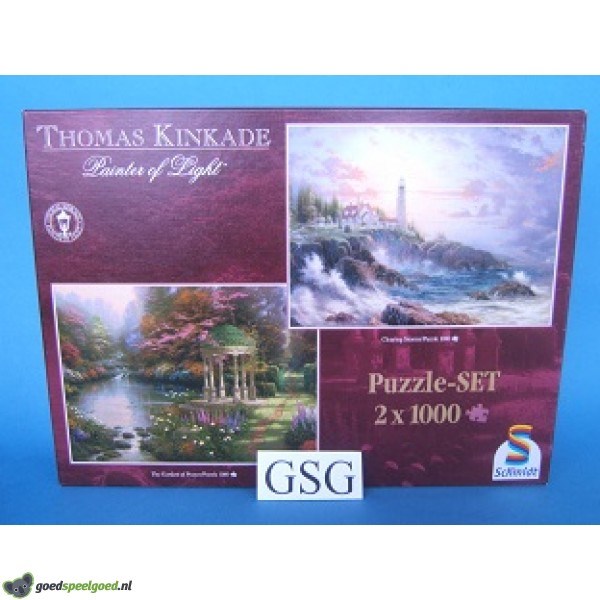 2 puzzels van 1000 stukjes in 1 doos met als thema clearing storm & the garden of prayer van het merk Schmidt. Deze puzzels zijn geschilderd door Thomas Kinkade die ook wel de Painter of Light wordt genoemd, hij schildert als het ware met licht.