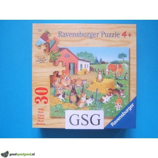 Houten puzzel van 30 stukjes met als thema dieren op het platteland van het merk Ravensburger. Zit nog in de ongeopende originele verpakking.