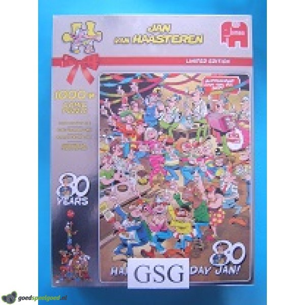 Puzzel van Jan van Haasteren uit 2016 van 1000 stukjes met als thema fijne verjaardag Jan! van het merk Jumbo. Hiep Hiep Hoera! Jan van Haasteren is 80 jaar geworden! Ter ere van deze bijzondere verjaardag brengt hij deze speciale puzzel uit. Een limited edition die niet mag ontbreken in de collectie! Deze speciale puzzel is getekend door Jan van Haasteren in 1977 en is dan ook zijn allereerste plaat op groot formaat. Jan heeft de plaat destijds in opdracht getekend en deze is toen als reclame poster gebruikt. Na het uitbrengen van deze plaat nam de carrière van Jan van Haasteren een vlucht en de rest is geschiedenis. Deze bijzondere uitgave van Jan van Haasteren komt in een unieke, feestelijke zilveren verpakking. Zit nog in de ongeopende originele verpakking.