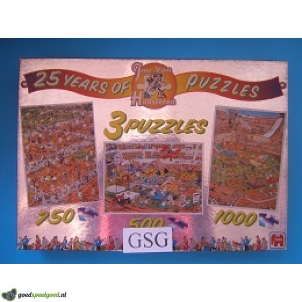 Twee puzzels van Jan van Haasteren in 1 doos. Het zijn tennis van 750 stukjes uit 1993 en olympische spelen van 1000 stukjes uit 1983. Let op!, Er zitten maar 2 puzzels in deze doos en er zitten geen posters bij. Dit is een gelimiteerde oplage uitgegeven ter gelegenheid van het 25 jarig jubileum van Jan van Haasteren.