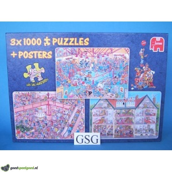 Drie puzzels van Jan van Haasteren in 1 doos. Het zijn bokswedstrijd van 1000 stukjes uit 2002, de uitverkoop van 1000 stukjes uit 2001 en de contourpuzzel hotel uit 1997. Bij de puzzels zitten drie posters.
