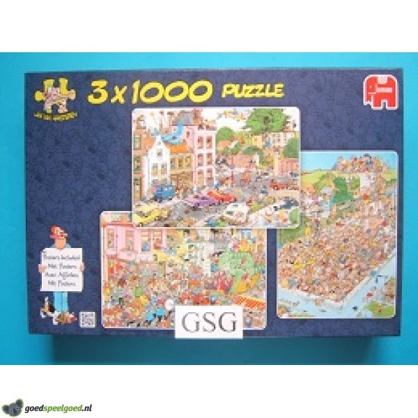 Drie puzzels van Jan van Haasteren in 1 doos. Het zijn vrijdag de 13e van 1000 stukjes uit 200, carnaval van 1000 stukjes uit 2000 en zwembadpret van 1000 stukjes uit 1993. Bij de puzzels zitten drie posters.