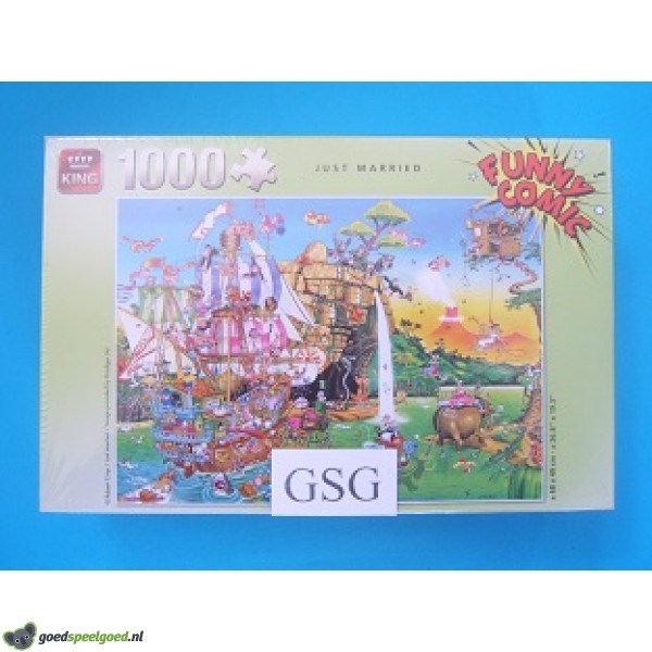 Puzzel van 1000 stukjes met als thema just married van het merk King. Zit nog in de ongeopende originele verpakking.