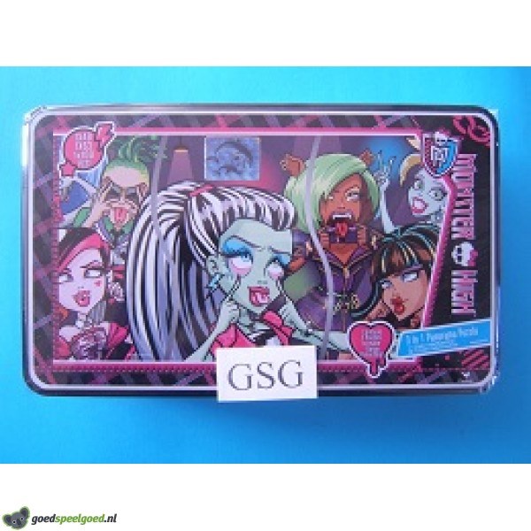 1 puzzel van 48 stukjes, 1 puzzel van 63 stukjes en 1 puzzel van 100 stukjes met als thema Monster High van het merk Mattel. De puzzels zitten in een luxe opbergblik en ze vormen samen 1 grote panorama puzzel. Puzzel is nog helemaal nieuw.