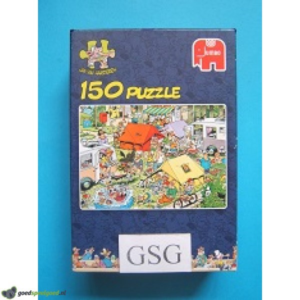 Puzzel van Jan van Haasteren uit 2012 van 150 stukjes met als thema op de camping van het merk Jumbo.