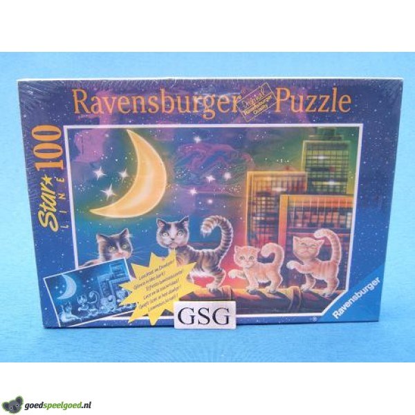 Puzzel van 100 stukjes met als thema poezen in de maneschijn van het merk Ravensburger. Zit nog in de ongeopende originele verpakking.