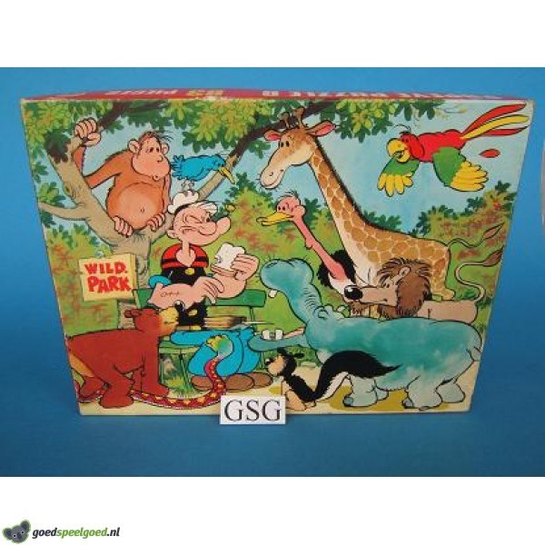 Puzzel van Jan van Haasteren uit 1975 van 63 stukjes met als thema wildpark (Popeye) van het merk King Eldorado. Let op!, van deze puzzel is een stukje beschadigd.