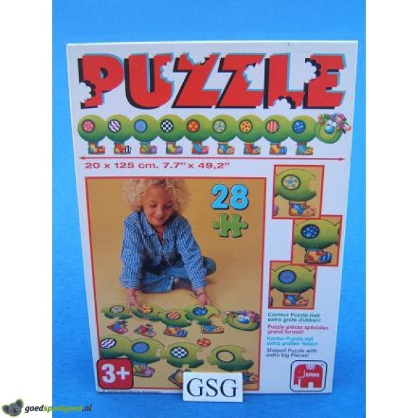 Rups puzzel van 28 stukjes van het merk Jumbo. Puzzel het hoofd en het lijf van de rups, houd de cirkels en laarzen apart. Hierna zijn er drie mogelijkheden om de puzzel af te maken.