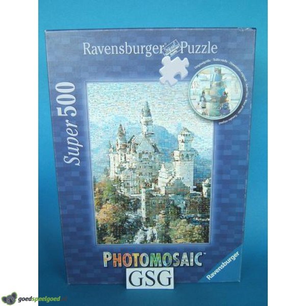 Photomosaic puzzel van 500 stukjes met als thema slot Neuschwanstein van het merk Ravensburger. Alle puzzelstukjes bestaan uit kleine foto's.