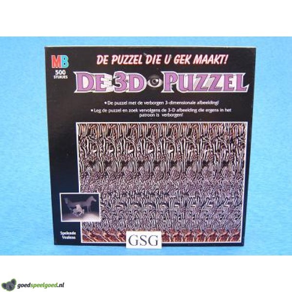 Puzzel van 500 stukjes met als thema spelende veulens van het merk MB. De puzzel die u gek maakt. Leg de puzzel en zoek vervolgens de 3-D afbeelding die ergens in het patroon is verborgen.
