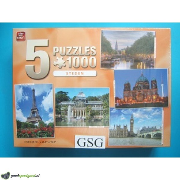 Vijf puzzels van King in 1 doos. Het zijn de hoofdsteden Parijs, Amsterdam, Madrid, Berlijn en Londen. Zit nog in de ongeopende originele verpakking.