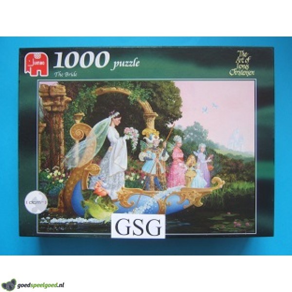Puzzel van 1000 stukjes met als thema the bride van het merk Jumbo. Deze puzzel is een werk van James Christensen. Dit is een kunstenaar die vooral bezig is met het tekenen van extravagant geklede dwergen en feeën. Zijn werk is in vele collecties terug te vinden, en word uitbundig geprezen voor zijn uitgesproken fantasie en prachtige puzzelplaten.