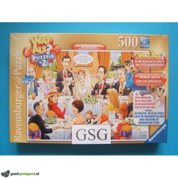 Puzzel van 500 stukjes met als thema de bruiloft van het merk Ravensburger. Wat als de bruidegom de grote dag zou organiseren? De afbeelding op de doos laat de droombruiloft van de bruid zien. Maar de puzzel in de doos laat de onvergetelijk dag volgens de bruidegom zien. Zit nog in de ongeopende originele verpakking.