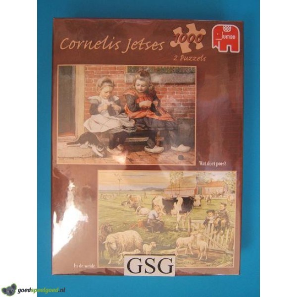 2 puzzels van 1000 stukjes in 1 doos met als thema wat denkt de poes & in de weide van het merk Jumbo. Deze puzzels zijn een werk van Cornelis Jetser. Zit nog in de ongeopende originele verpakking.