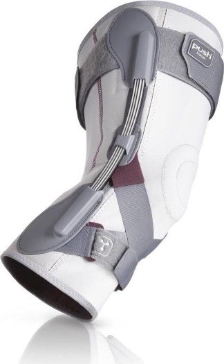 De Push Med kniebrace biedt een hoge mate van ondersteuning aan het kniegewricht in medio-laterale richting. De knie wordt ondersteund door 2 bladveerscharnieren die op unieke wijze de natuurlijke rotatiebeweging van de knie volgen. Hierbij wordt buigen en strekken van de knie niet gehinderd. De bandconstructie zorgt voor een goede aansluiting van de baleinscharnieren tegen het gewricht.