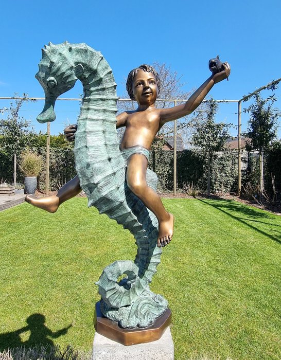 Prachtig sculptuur van een jongen op zeepaard. Bronzen tuinsculptuur. Het beeld heeft een wateraansluiting waardoor je hem als fontein kan gebruiken. Het water zal dan spuiten uit de vis die de jongen vasthoudt. Een echt prachtstuk en van zeer hoge kwaliteit. De afmetingen van dit sculptuur zijn ongeveer als volgt: