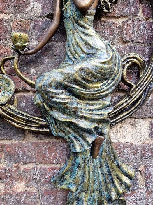 Prachtstuk - Bronzen muursculptuur van een elf / Vrouw in een bloemencirkel. Gemaakt uit brons, prachtige charme. Feerieke en magische tuindecoratie. Gevelkunst. De afmetingen van dit zware bronzen kunstwerk zijn als volgt (+/-):