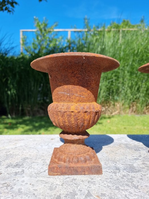Koppel gietijzeren vazen. Roestpatine. Iedere vaas met de volgende afmetingen (+/-):