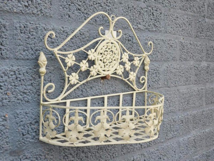 Hier kunt u in een antieke stijl ontworpen smeedijzeren wandrek in de kleur gebroken wit gelakt verkrijgen.