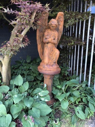 Deze engel is van een hoge kwaliteit, weerbestendig en fantastisch uitziend product vooral op deze mooie bijpassende sokkel. Dit engel figuur is een betoverend beeld in de tuin en ook uitstekend als ernstige decoratie bij een graf - Een mooie engel figuur, dat voorzichtige vroomheid en christelijke cultuur uitstraalt !. Als een romantische opvallende, omringd door klimop planten - beïnvloedt de engel een rustige en antieke uitstraling individueel en verrassend levensecht ! Heerlijk dromerig en introspectief knielend is deze fijn gevormde tuinengel bijzonder in het oog springend staand onder struiken en bomen. Dit beeld werd gemaakt door de artistieke kant van een beeldhouwer uit de vorige eeuw. Na de ontdekking van deze grote figuur, werd deze opnieuw gemaakt voor vandaag de dag in een hoge kwaliteit casting van beeldende oxid steenkleur..