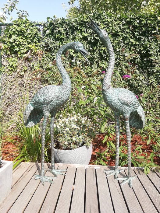 Zeer grotestukken en prachtig voor in uw tuin. Deze vogels kunnen gebruikt worden als fontein, aansluiting is voorzien aan de voeten en het water spuit dan uit de bek! Prachtig voor aan een vijver of in een mooie groene tuin. Prachtige patina.Twee modellen, 1 met gestrekt hoof en 1 met gebogen hoofd. Afmetingen ongeveer hetzelfde. Afmetingen met het gestrekte hoofd: