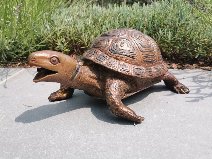Betreft hier een prachtigebronzen schildpad, met spuitmond. In uitstekende staat en met mooie charme. Zeer gedetailleerd afgewerkt. Staande pose.. Brons bruine patine. Wateraansluiting voorzien aan de staart, mooi fonteintje. De afmetingen zijn als volgt (+/-):