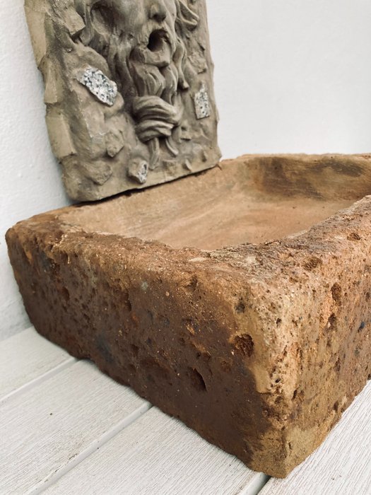 Wastafel in gebeeldhouwde kalksteen, met aangehechte sculptuur van de fonteingezichtsvuller met marmeren spaanders, gegoten steen (totale hoogte van de fontein 50 cm), uitstekende staat van instandhouding, van een particulier, gelegen in het zuiden van Campanië, uitstekende afwerking en definitie van de details, adequate verzending naar het item en track geschatte periode