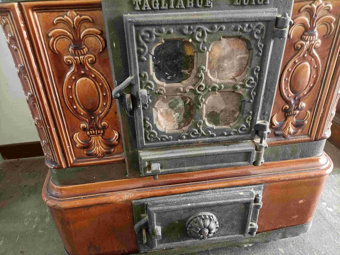 Houtkachel volledig bedekt met majolica, nooit gebruikt, naar schatting uit het begin van de 20e eeuw door het bedrijf Tagliabue.