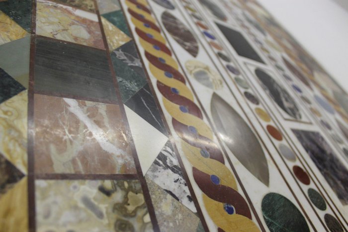 Rechthoekig marmeren blad in wit marmer, volledig ingelegd met monsters van halfedelstenen en polychroom marmer, waaronder: lapis lazuli, aquamarijngroen, porfier, rode levanto, malachide, enz., enz. eind 19e eeuw.
