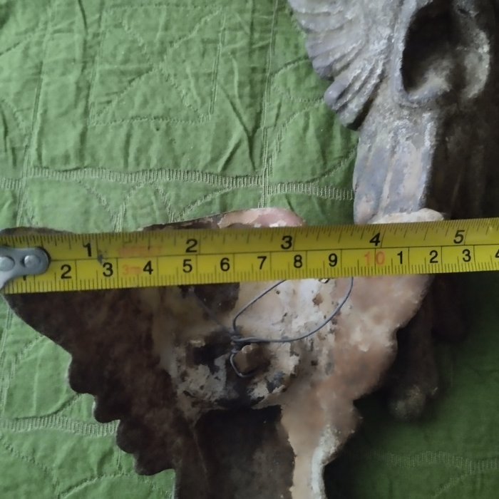 Twee gevleugelde, hoekige, gietijzeren maskers.