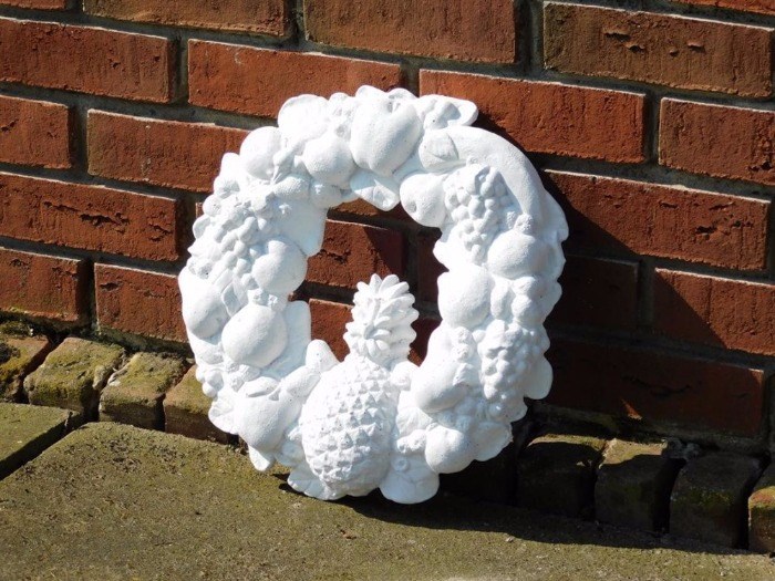 Deze leuke, decoratieve fruitkrans is volledig gemaakt van steen.