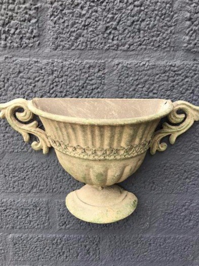 Deze vaas is uit metaal in age-green, gewoon heel fraai om in meerdere aan de tuinmuur te hangen en