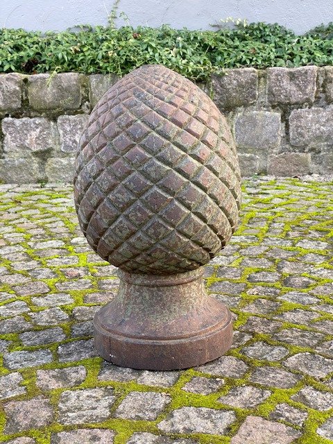 Een groot gietijzer tuinornamenten in de vorm van een dennenappel